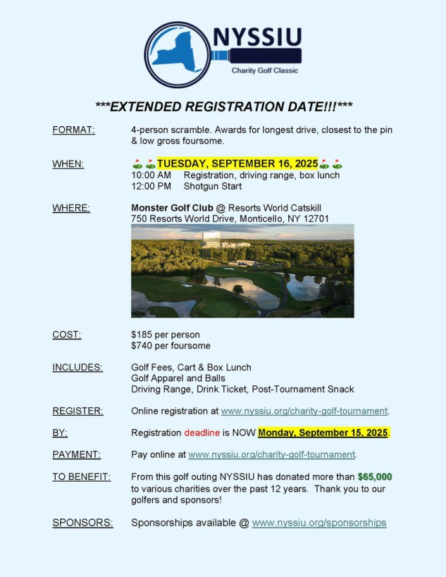 Our NYSSIU Annual Charity Golf Classic will be held this year on Tuesday, September 16, 2025. Sponsorship payments can be made on our Sponsor Opportunities page. Please contact NYSSIU for more details at NYSSIU@GMAIL.COM.